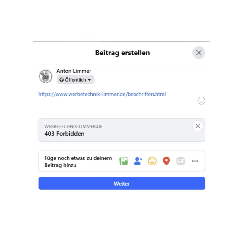 Ich kann z.B. die Startseite teilen es wird aber kein Bild angezeigt. Bei anderen Seiten erscheint 403 Forbidden