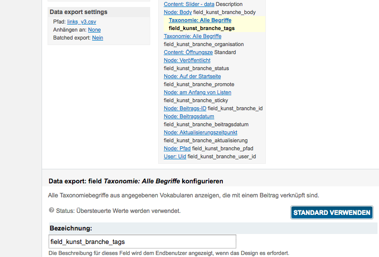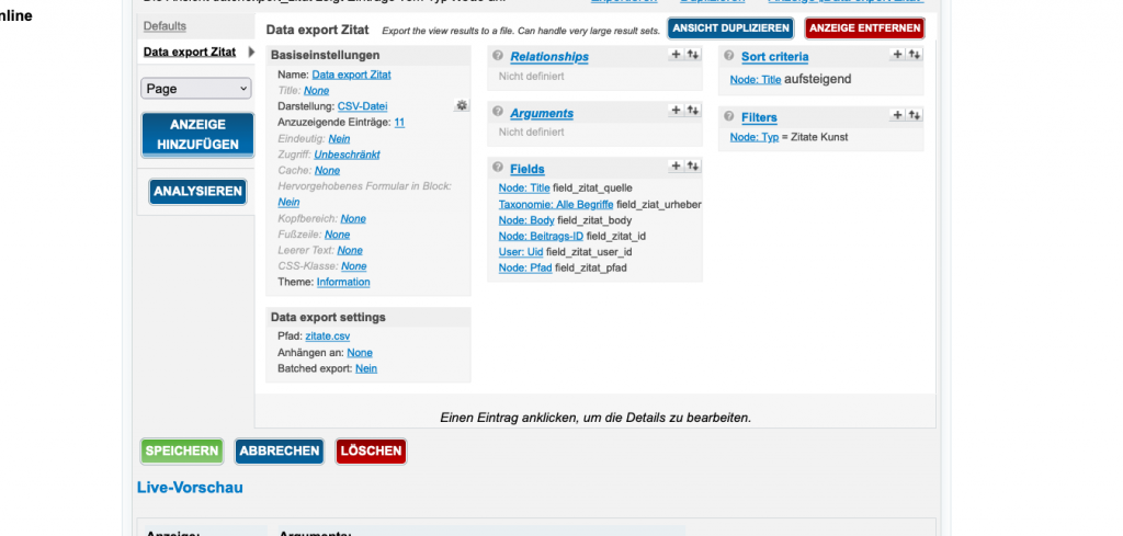 Unter D6 richtest Du einmal die Views für CSV-Export ein.