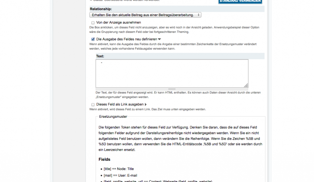 Wenn Beiträge mit Taxonomie-Begriffen verknüft sind, geben Sie das bzw. die zugehörigen Vokabulare an. Dieser Beziehungstyp kann zur mehrfachen Ausgabe von Treffern in der Ergebnismenge führen.