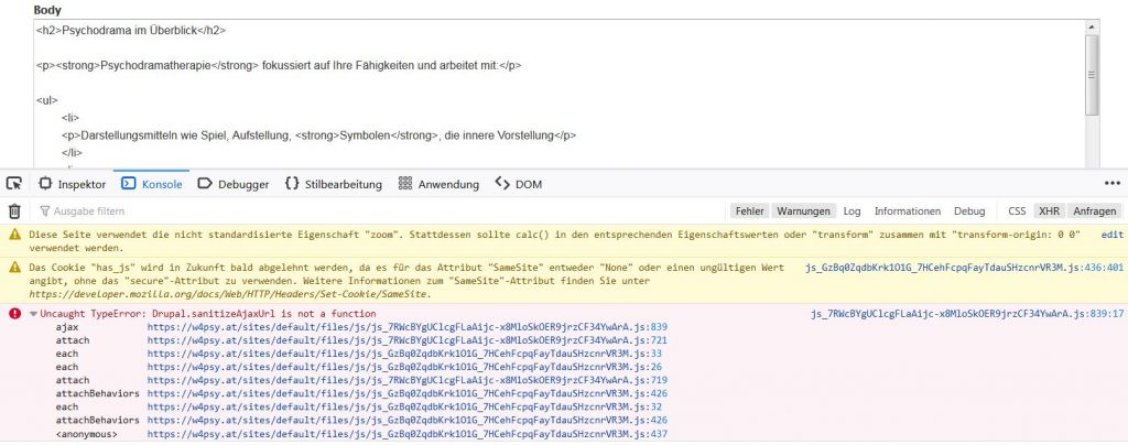 Mit D watchdog oder apache error log bin ich jedenfalls überfordert. Mit den gegoogelten Hinweisen von drupal-sanitizeajaxurl... fange ich nichts an, das ist mir einfach zu komplex. Wenn du dich erinnerst, ich habe mich aug´ch in composerologie versucht, da sind ähnliche Grenzen aufgetreten. Ist nicht mein Berufsfeld.