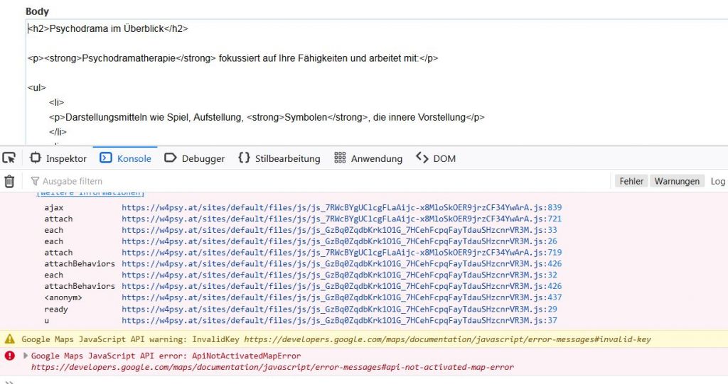 Die Fehlermeldung bezüglich Google Map besagt, dass Du keinen API Key eingetragen hast.