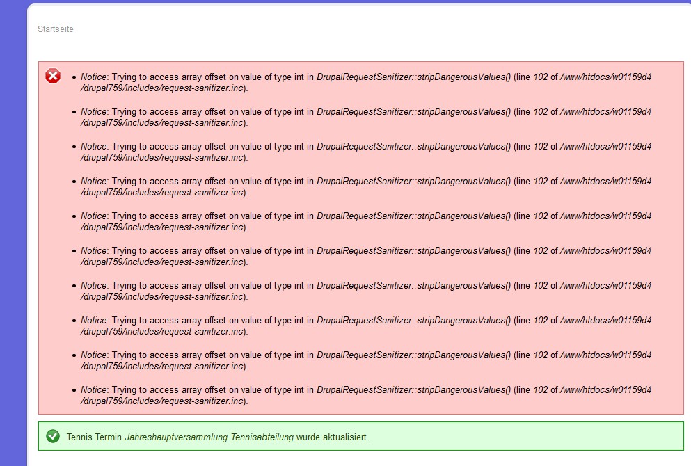 Ich habe unserer website (www.tsvdahl.de) ein update verpasst. Manuell wie beschrieben, beim Ausführen von update.php gab es zwar zweimal Warnungen, aber dann schien alles ok. Wenn ich aber nun die Webseite aufrufe und z.B. etwas ändere, so erhalte ich die im Bild widergegebene Warnungen.