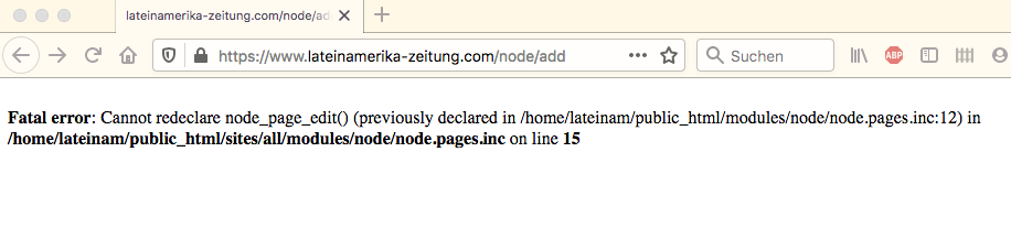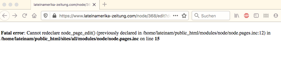 Fatal error: Cannot redeclare node_page_edit() (previously declared in /home/lateinam/public_html/modules/node/node.pages.inc:12) in /home/lateinam/public_html/sites/all/modules/node/node.pages.inc on line 15