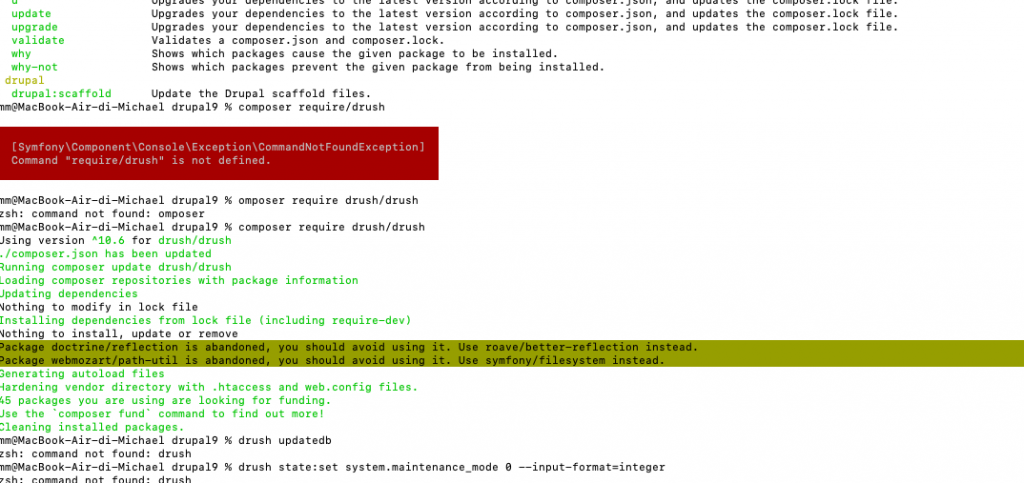 drush state:set system.maintenance_mode 0 --input-format=integerWas den Snapshot betrifft, ist der nur von den Daten in /Applications/MAMP/htdocs/drupal9/ oder ist da die Datenbank auch mitgesichert? Die ist auf jeden Fall unbedingt wichtig zu sichern, da sind alle eingegebenen Daten drin und die Einstellungen.