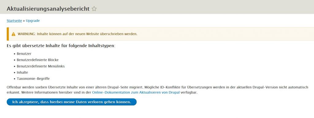 Im Upgrade UI trage ich die Datenbank-Daten ein und die Überprüfung ist erfolgreich. Danach kommen ich auf eine Seite "Analysebericht", in dem gewarnt wird, dass ich übersetzte Inhalte migriere (s. Bild im Anhang). Wenn ich nun auf "Ich akzeptiere ..." klicke, erscheint im Browser untenstehende Fehlermeldung. Leider finde ich hierzu keine Lösung oder Lösungsansatz. Die Interpretation des Fehlers fällt mir auch schwer. Kann mir vielleicht jemand helfen, dem Fehler auf die Spur zu kommen?