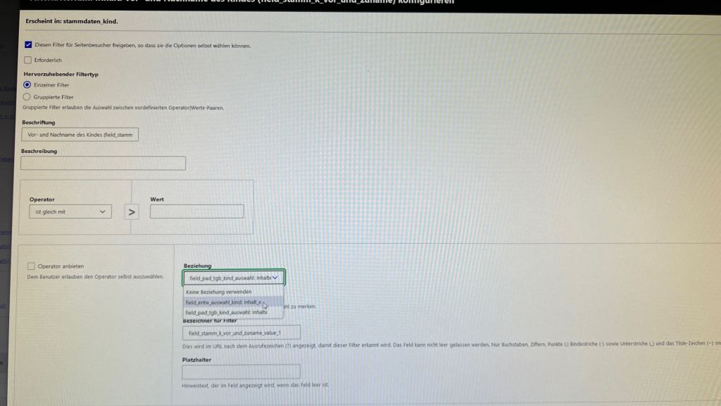 Wie kann ich einen Dropdown-Filter nutzen, der wird mir nie angezeigt. Ich müsste dazu gruppierte Felder (im Filter auswählen) und jedes Kind extra schreiben. Das wären schon jetzt 50 Kinder. Das möchte ich gerne umgehen, zumal bei jedem neuen Kind das automatisch von der view übernommen werden soll. Ich möchte nicht zukünftig bei jedem weiteren Kind dran denken, es in die View einzubasteln.
