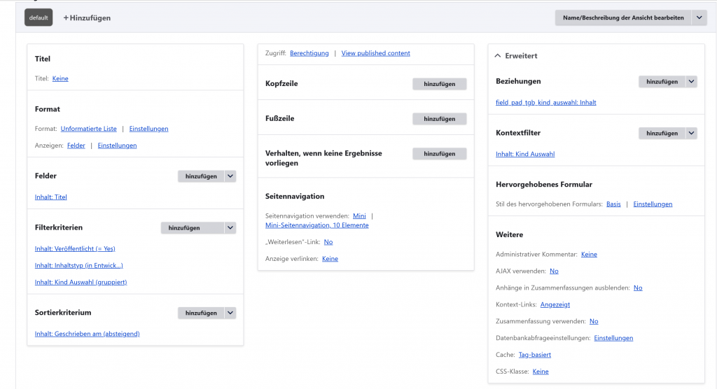 Die view ist erstmal nackt, gefiltert nach Inhaltstypen nur diese wo das Feld vorkommt, also Stammdaten, Wochenbericht, Entwicklungsbericht. Unter Beziegungen suche ich das Feld Vor- und Zuname (dazu steht dann: erscheint in Stammdaten, Entwicklu....), dazu noch Beziehung ist erforderlich anklicken, ansonsten erscheinen noch andere Inhalte von ganz anderen Inhalsttypen wie Article oder so.