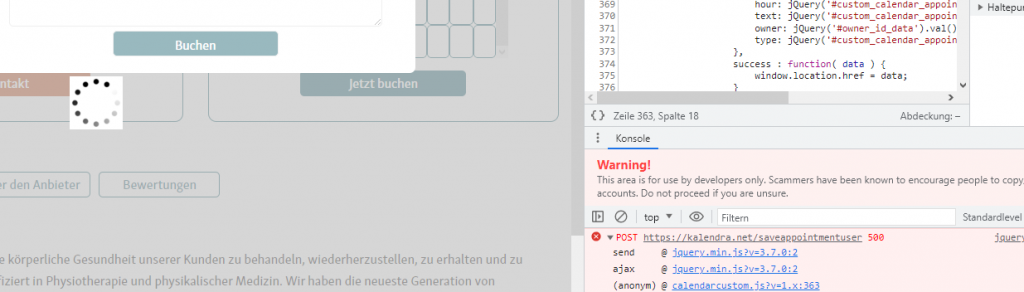 Ich erhalte in der Konsole nachdem ich auf Terminbuchung klicke in der Konsole einen Fehler. Der Termin wird zwar gebucht aber die Seite bleibt wie im Bild im Anhang.