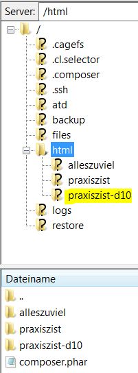 Es geht um eine Drupal 10 Neu-Installation, PHP 8.2 in Betrieb; ich habe im (siehe Bild) /html Verzeichnis den composer in der aktuellen Version installiert. Meine Neuinstallation soll in das gelb markierte Verzeichnis (praxiszist-d10)