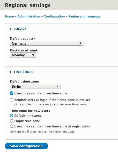 Meinst Du die Einstellung unter Administration > Configuration > Region and Language ? Meine Konfiguration habe habe ich im Bild angehängt.