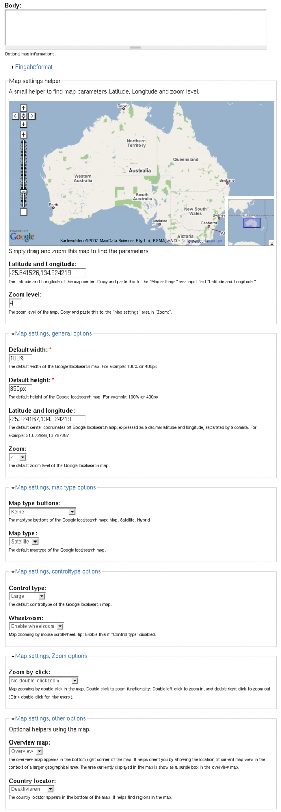 Mit dieser Vorgehensweise kann ein beliebig erstellter Inhaltstyp mit einem der verfügbaren Maps versehen werden. Um dies zu realisieren wird der im Googlemap Modul bereitgestellte Code im Nodetype-Template eingefügt. Bei Bedarf kann der einfügbare Code über ein eigenständiges Themefunktion-Template bearbeitet werden. Im Pagetemplate des Theme sind Variablen (2 oder 3) einzufügen die von einer Map-Node benötigt werden.
