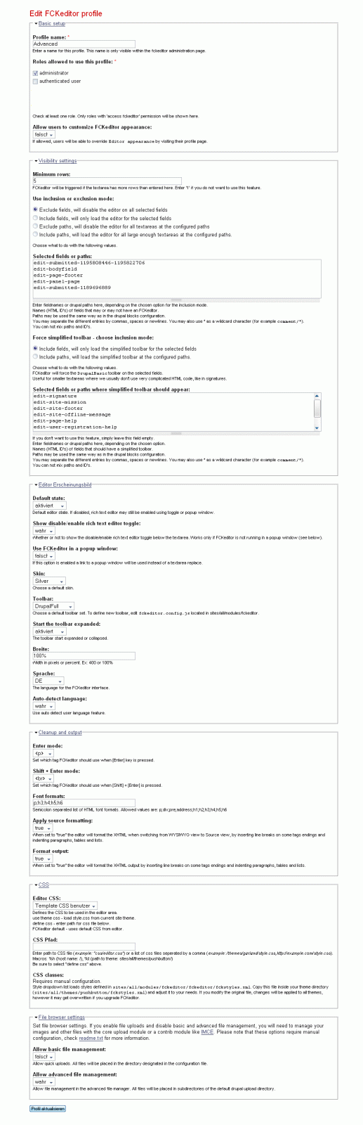 sites/all/modules/fckeditor/fckeditor.cssvorhanden ist? Bei mir gibt es diese Datei in dem Pfad nicht. Hast du außerdem ein Update der Datenbank gemacht, nachdem du die neue Version des FCKEditor Moduls installiert hast? Am Besten löschst/deinstallierst das Modul nochmal und beginnst von vorne. Am Besten löschst du dann auch die Einträge von FCKEditor in der system Tabelle der Datenbank. Löschen und neu installieren ist auf jeden Fall schneller als die Fehlersuche.Hallo Anja,