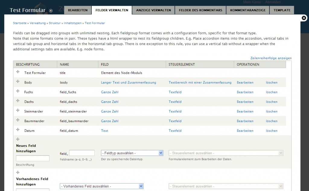 1. Ich habe einen neuen Inhaltstyp erstellt, hier: "Test Formular", die user sollen dort für eine Tierzählung Ihre Eingaben machen.